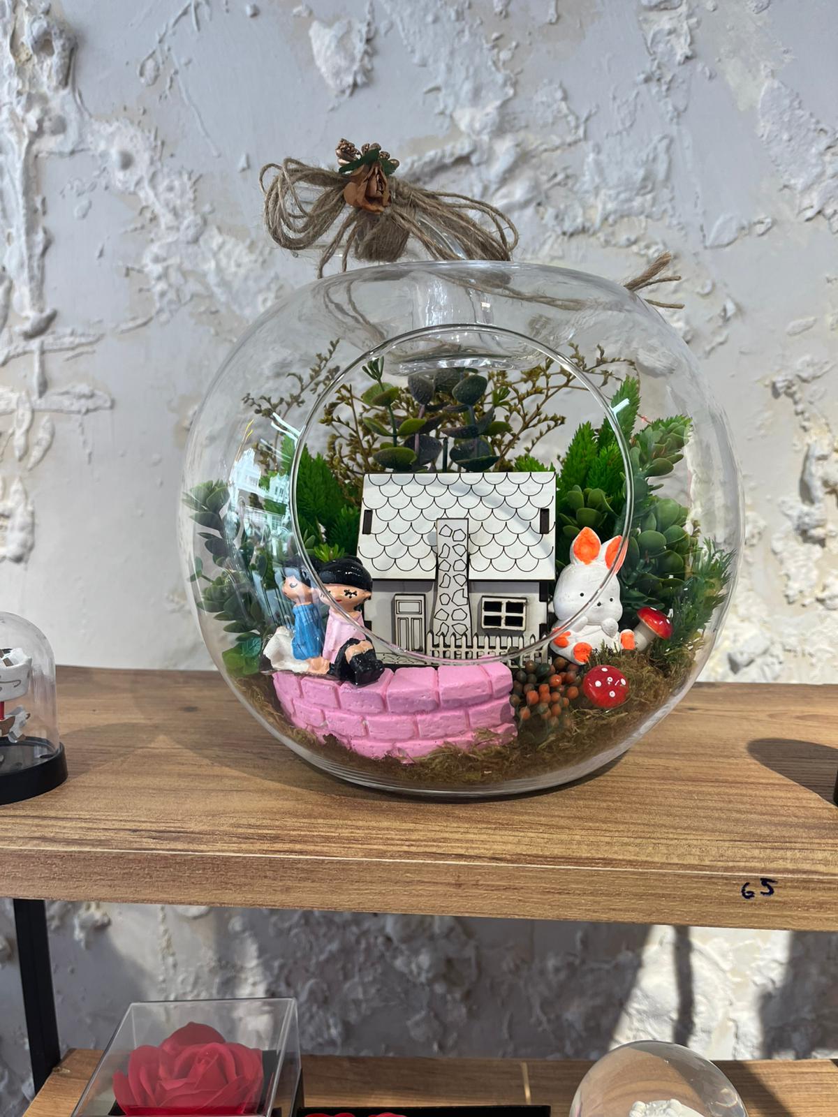 Cam Fanus İçinde Sevimli Ev, Aşık Çift ve Tavşanlı Teraryum Aranjmanı